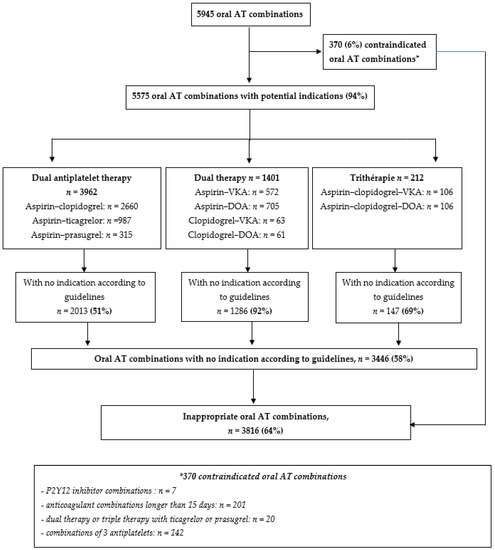 Inappropriate oral AT combinations were defined as deliveries not complying with the guidelines, according to the synthesis of international guidelines [16], considering the medical indication for use only, but not dosage or treatment duration. It may be appropriate to prescribe outside the guidelines for some individuals or contexts, but these situations are rare and specific [16,17], and most of them were excluded from this study (requiring an expert opinion: auto-immune disease, hemophilia, HIV, or active cancer). Duration of oral AT combination use and dose of oral AT were not considered for compliance with guidelines, because the recommended duration may vary according to the bleeding risk, which cannot be precisely assessed in the database, and because creatinine clearance and weight data, required to determine the recommended dose, are not available in the database. We first considered, as inappropriate: (1) oral AT combinations always contraindicated (P2Y12 inhibitor combinations, anticoagulant combinations used longer than 15 days, dual therapy or triple therapy with ticagrelor or prasugrel and combinations of 3 antiplatelets), and (2) other oral AT combinations with no indication identified, in accordance with the guidelines. For this, for each type of oral AT combination (dual antiplatelet therapy, dual therapy [i.e., one antiplatelet and one OAC], triple therapy [i.e., 2 antiplatelets and one OAC]), we searched within the 3 (dual antiplatelet and triple therapy) or 6 months (dual therapy) before the first delivery of oral AT combinations to determine whether the individual had a recommended indication for treatment (as appropriate, see Supplemental Table S1 and Supplemental Text S1) [16]. Events leading to the delivery of oral AT combinations are easily identifiable in the EGB, and only recent events can lead to oral AT combination prescriptions.