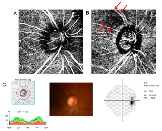 (A) Superficial peripapillary OCT angiography in the superficial layer (from the retinal nerve fiber layer (RNFL) to 130 μm below the internal limiting membrane (ILM) including the ganglion cell-inner plexiform (GCIPL) layer). (B) Deep peripapillary OCT angiography in the deep layer (from 130 μm below the ILM to the basement membrane including the inner nuclear layer (INL)). (C) RNFL OCT and visual field test with increased cup-disc ratio (CDR) which indicate glaucoma suspect. There are subjects among glaucoma suspect patients with wedge-shaped VD defect in the deep layer of peripapillary area (indicated as arrows in B), even though the vessel density in the superficial layer is unaffected (intact vascular status in A).