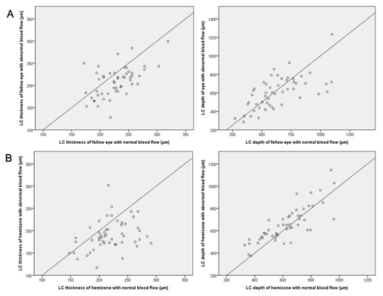 The inter-eye or inter-hemizone correlations between LC thickness and depth are described in Figure 2 using scatterplots. Most eyes with deep peripapillary VD defects had thinner lamina. Most hemizones with deep peripapillary VD defects also had thinner and even deeper LC.