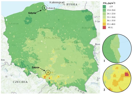 Spatial modeling of PM10 pollution in Poland. Inserts show Zabrze (1) and Gdynia (2).