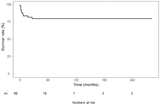 Overall survival was shown in this figure. Overall survival rate was 81.8%, and the median follow-up period was 35 months.