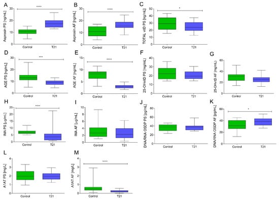The studied protein concentrations measured in the plasma and amniotic fluid samples. Different asterisks above the bars indicate significant differences compared to the control (* p ≤ 0.05; *** p ≤ 0.001; **** p ≤ 0.0001). (A) Plasma asprosin; (B) amniotic fluid asprosin; (C) plasma total vitamin D; (D) plasma advanced glycation end products; (E) amniotic fluid advanced glycation end products; (F) plasma 25-OH vitamin D; (G) amniotic fluid 25-OH vitamin D; (H) plasma ischemia-modified albumin; (I) amniotic fluid ischemia-modified albumin; (J) plasma DNA/RNA oxidative stress damage product; (K) amniotic fluid DNA/RNA oxidative stress damage products; (L) plasma alfa-1-antitrypsin; (M) amniotic fluid alfa-1-antitrypsin. A1AT, alfa-1-antitrypsin; AF, amniotic fluid; AGE, advanced glycation end products; Control, control group; IMA, ischemia-modified albumin; OSDP, oxidative stress damage product; PS, plasma; T21, trisomy 21.