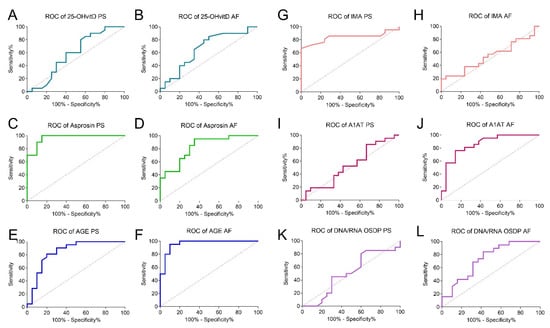 ROC curves of the studied parameters. (A) Plasma 25-OH vitamin D; (B) amniotic fluid 25-OH vitamin D; (C) plasma asprosin; (D) amniotic fluid asprosin; (E) plasma advanced glycation end products; (F) amniotic fluid advanced glycation end products; (G) plasma ischemia-modified albumin; (H) amniotic fluid ischemia-modified albumin; (I) plasma alfa-1-anitrypsin; (J) DNA/RNA oxidative stress damage product; (K) plasma DNA/RNA oxidative stress damage products; (L) amniotic fluid DNA/RNA oxidative stress damage products. AF, amniotic fluid; PS, plasma; OS, oxidative stress.
