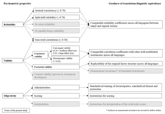 The present study focuses on the analyses of reliability, convergent and discriminant validity of eight PROMs in nine TBI language samples with enough participants (i.e., at least 50 participants in the Dutch, English, Finnish, French, German, Italian, Norwegian, Spanish, and Swedish samples) as well as factorial validity in six samples (i.e., at least 150 participants in the Dutch, English, Finnish, Italian, Norwegian, and Spanish samples). Figure 1 provides an overview of our psychometric analyses according to the classical test theoretical (CTT) criteria with the respective cut-off values [49].
