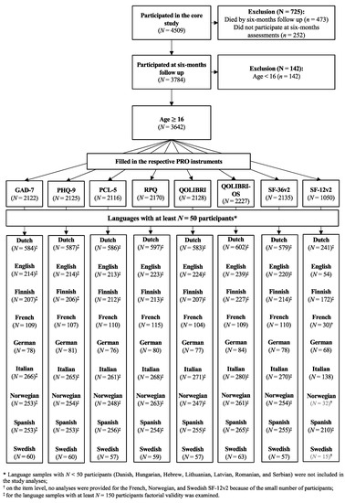 The number of participants varied between PROMs, since not every participant filled in each instrument at the six-months outcome assessment. Sample characteristics for each instrument and language are provided in the Online Supplement (OS 1: Sample characteristics, Tables S1–S8). A brief overview on the sample compositions used for the analyses is presented in Figure 2. Appendix A (Table A1) provides additional information on the number of participants for the validity analyses using the GOSE and the GCS.