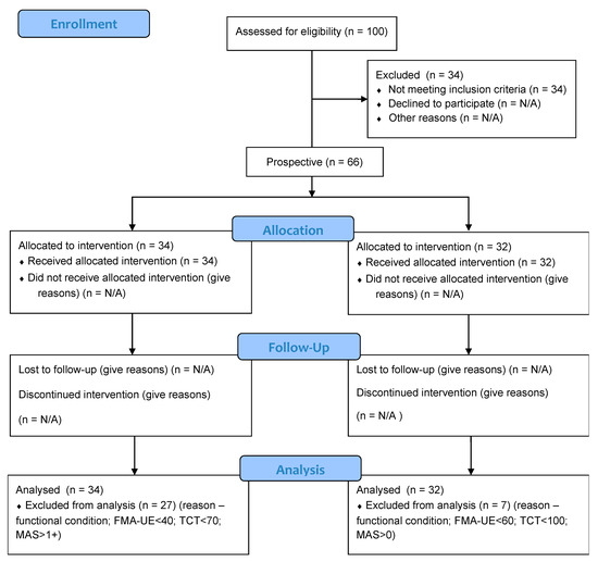 In this case, 34 subjects after ischemic cerebral stroke, (aged 44–83 years; mean, 64.1 ± 9.2 years); biometric data in Table 1. Study group were in the subacute (5–7 weeks past stroke) of the disease, with stable trunk (the Trunk Control Test 74–100 points), subjects were in a functional state allowing movements of the upper extremity (FMA-UE 43–49 motor function points); tension of forearm and hand muscles measured with Modified Ashworth Scale (MAS 1/1+) [40,41,42]. The clinical evaluation of patients after a stroke was performed by the physician admitting the patient to the clinic on the day of admission.