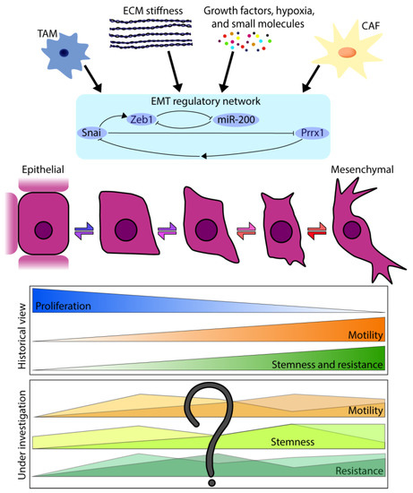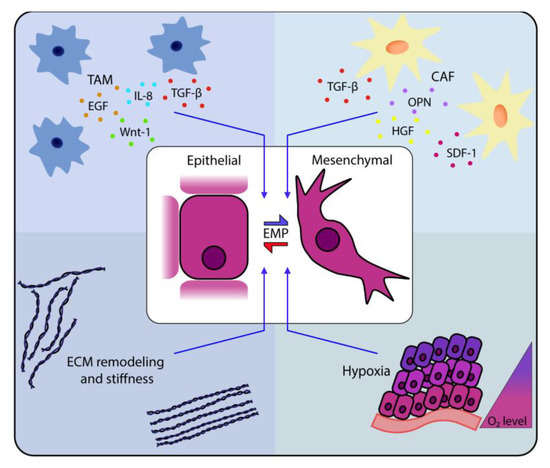 Microenvironmental cues such as soluble factors (growth factors and cytokines) or various extracellular triggers, e.g., extra-cellular matrix (ECM) rigidity or hypoxia, can drive EMP. Tumor-associated macrophages (TAMs) are an important source of many factors inducing EMP, including tumor growth factor beta (TGF-β), Wnt-1, EGF and IL-8. [89,90,91,92,93,94]. Furthermore, the presence of TAMs was correlated with progression on the epithelial-to mesenchymal axis [21]. Another major component of the TME are cancer-associated fibroblasts (CAFs), which also can produce EMP-inducing factors, including TGF-β, SDF-1, OPN and HGF [95,96]. Furthermore, stiffness of ECM or lack of oxygen (O2) have been shown to trigger EMP [97,98,99,100,101,102,103].