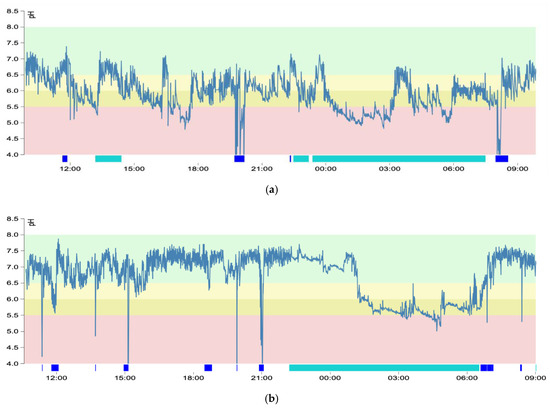 Moderate laryngopharyngeal reflux was composed of wide wave amplitudes reaching an area between pH 5.5 and 6.0 in upright and pH 5.0 and 5.5 in supine position. All deep drops in pH levels were due to mealtimes and were correctly logged; thus, they were excluded from calculation. During supine position, pH levels dropped in a smooth manner, in this case to moderate levels. This phenomenon is known as the nocturnal drop and drift (Figure 1b).