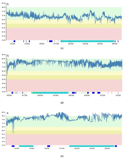 Alkaline laryngopharyngeal reflux had wide wave amplitudes reaching above the threshold of pH 8.0 in the upright and supine positions. The deep drops in pH levels below 6.5 were associated with mealtimes and were, therefore, excluded from calculation (Figure 1e).