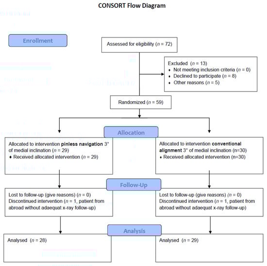 All procedures were performed between October 2019 and June 2020 by the same experienced senior surgeon (>200 knee UKA/year). The patient was placed in a supine position under spinal anesthesia and a tourniquet was inflated with 100 mmHg above the systolic blood pressure at the time of inflation. The quad-sparing-approach was performed in all patients. Subjects received an implant with a fixed bearing platform (Persona Partial Knee, Zimmer Biomet, Warsaw, IN, USA) for medial arthritis in 59 cases and a Physica ZUK (Lima Corporate, UD, Italy) in one case for lateral arthritis target. However, due to a different surgical approach and for the purpose of homogeneity in the evaluation, this case was removed for the data analysis. All cases were fully cemented and the same target values and radiographic analysis were used. The target component was the tibial implant, which was to be placed in 3° varus. In order to achieve that, a computer-assisted, pinless navigation device (Knee 2.6, Brainlab AG, Feldkirchen, Germany) was used for 30 patients. The accuracy of this system has already been investigated in several studies and was verified to be a precise and reliable pinless navigation system [,,,]. The setup consisted of a stand-alone computer with infrared cameras, controlled by a touch screen, and a pointer with reflector spheres as well as a reflector array. After bony exposure, the anatomical landmarks were mapped by the pointer, in particular the medial and lateral malleolus, the tibial anatomic axis and a.p.—direction of the tibia. Subsequently a standard extramedullary alignment rod from the Zimmer/Biomet system was attached perpendicular to the tibia and the reflector array was inserted into the cutting slot. Next, the correct alignment of the tibial cut was verified by the navigation system. For the remaining 30 patients, the standard extramedullary alignment rod was used to align the tibial component at 3° varus without computer-assisted guidance.