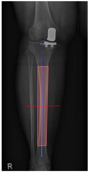 Within one year postoperatively, the clinical and radiological follow-up of the patients took place. Patients were routinely examined and surgery sites were controlled. Standard weight bearing radiographs in lateral projection as well as long-leg radiographs were taken. Subsequently, the inclination of the tibial component was determined. Radiographic analysis was performed in Horos for Mac, Version 3.3.6 []. First, the anatomical axis of the tibia was determined in the a.p. long-leg radiographs according to Paley []. Four points of the two cortices were marked, two in the proximal and two in the distal metaphysis, each with one on the lateral and one on the medial corticalis, resulting in a rectangle shape. Based on this, the software automatically calculated the center of the four landmarks and thus the longitudinal axis. Following that, the angle of the tibia component was calculated from the previously determined axis and the lower edge of the tibial implant. Figure 4 represents the measurement process. Two points on the medial and two on the lateral cortex were marked and thus the longitudinal axis was calculated. Next a tangent was drawn to the lower border of the tibial component and thus the medial inclination calculated between tangent and longitudinal axis.