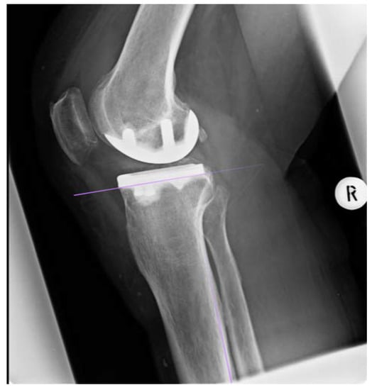 The posterior inclination of the tibial component was determined from the lateral radiographs according to Faschingbauer et al. []. One tangent was applied to the posterior cortex, another to the caudal end of the component. Thus, the angle was calculated between the two lines. This process of measurement is shown in Figure 5.