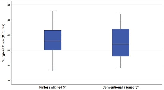Mean incision to suture time in the navigation group was 44.2 min +/− 4.4 and 42.7 min +/− 5.1 in the control group. The difference was statistically not significant, p = 0.13. Boxplots showing the range of incision to suture time are illustrated in Figure 7.