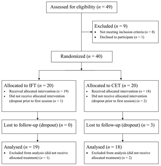 Of the 40 participants (65 years of age (SD 9)) randomized to receive either IFT or CET, 37 completed at least one session of their allocated treatment. As reported in Figure 1, no dropouts were observed among participants randomized to IFT, while 3 participant dropouts were observed in the CET group. Furthermore, two participants could not safely complete 30 min of walking on the treadmill and were switched to the total body recumbent stepper (participant numbers CET08 and CET15). As reported in Table 1, 35% of the randomized participants were female, and most suffered an ischemic stroke (31/40). No statistically significant group differences were observed for baseline characteristics. The average BMI was 27.8 kg m−2 (SD 4.7), corresponding to the overweight category based on the American College of Sports Medicine classification []. Although participants were, on average, evaluated 34 months (SD 29) after their first disabling stroke, many survivors were left with significant impairment. Accordingly, 63% of participants had NIHSS scores >5 or Chedoke-McMaster Stage of Recovery Leg or Foot scores <6, indicating moderate levels of impairment [,]. On average, participants had very poor levels of cardiorespiratory fitness 16.0 mL min−1 kg−1 (SD 5.0) according to age and sex-based normative data []. In fact, 60% had scores below the minimum threshold required for completing daily activities without inducing excessive fatigue (i.e., 18 to 20 mL min−1 kg−1) [,]. Accordingly, the current cohort represents the full range of impairments and functional limitations observed in community dwelling stroke survivors.