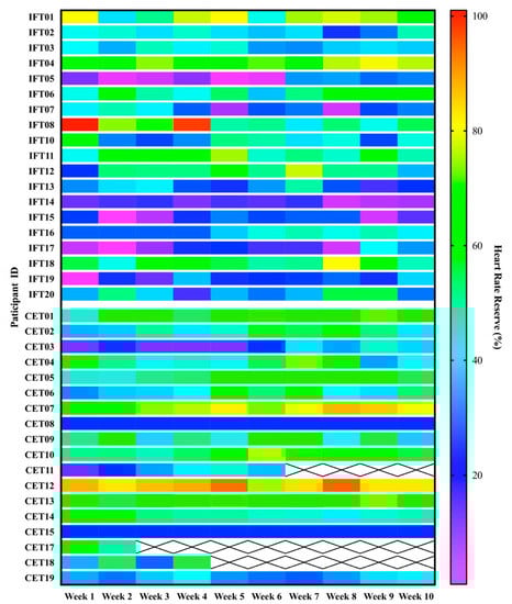 Dose analysis. Heatmap displaying participant’s average heart rate during each week of aerobic exercise training. The graph’s top and bottom halves are separated for intermittent functional training (IFT) and constant-load ergometer training groups (CET), respectively. Dark blue and purple cells indicate workloads below the moderate-intensity aerobic exercise threshold (i.e., <40% HRR).