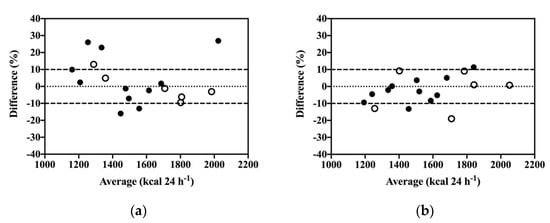 Bland–Altman analysis of agreement between measured resting energy expenditure via indirect calorimetry and predicted energy expenditure via the Mifflin-St Jeor equation during pre (a) and post assessments (b). IFT (n = 11) closed circles; CET (n = 6) open circles.