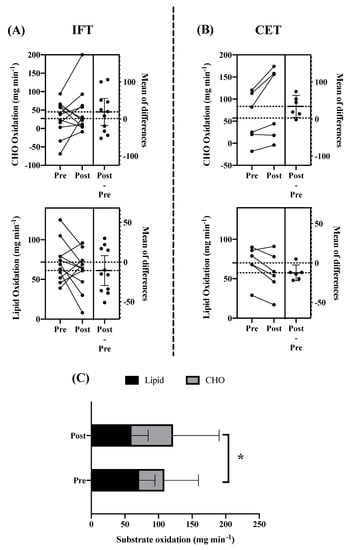 Resting Substrate Partitioning. Changes in rates of resting carbohydrate (CHO) and lipid oxidation over the intervention period. (A) Intermittent functional training (IFT), (B) constant-load ergometer training (CET), and (C) combined groups. Panels A and B display individual changes along with mean difference and 95% CI. Panel C displays pre to post changes in substrate partitioning across both groups, * p < 0.05.