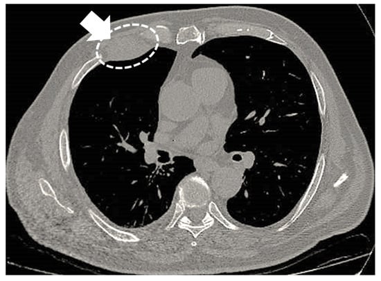 - Lacle, M.M.; Van Oosterhout, M.F. An Unusual Presentation of Malignant Pleural Mesothelioma. J. Thorac. Oncol. 2013, 8, e63–e64. [Google Scholar] [CrossRef]