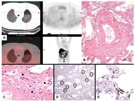 - Larsen, B.T.; Klein, J.R.; Hornychová, H.; Nuti, R.; Thirumala, S.; Leslie, K.O.; Colby, T.V.; Tazelaar, H.D. Diffuse intrapulmonary ma-lignant mesothelioma masquerading as interstitial lung disease: A distinctive variant of mesothelioma. Am. J. Surg. Pathol. 2013, 37, 1555–1564. [Google Scholar] [CrossRef]