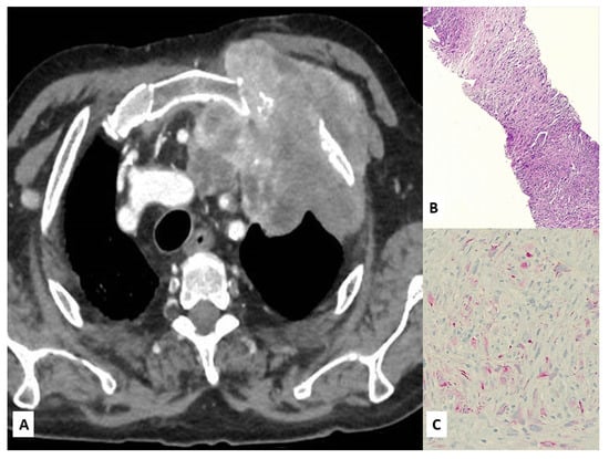 - Rapicetta, C.; Taddei, S.; Casali, M.; Valli, R.; Lococo, F.; Treglia, G.; Paci, M. Metástasis infrecuente de mesotelioma pleural detectada mediante 18 F-FDG PET/TC de cuerpo entero. Rev. Española Med. Nuclear Imagen Mol. 2018, 37, 125–127. [Google Scholar] [CrossRef]