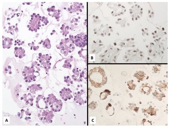 - Facchetti, F.; Lonardi, S.; Gentili, F.; Bercich, L.; Falchetti, M.; Tardanico, R.; Baronchelli, C.; Lucini, L.; Santin, A.; Murer, B. Claudin 4 identifies a wide spectrum of epithelial neoplasms and represents a very useful marker for carcinoma versus mesothelioma diagnosis in pleural and peritoneal biopsies and effusions. Virchows Archiv 2007, 451, 669–680. [Google Scholar] [CrossRef] [PubMed]