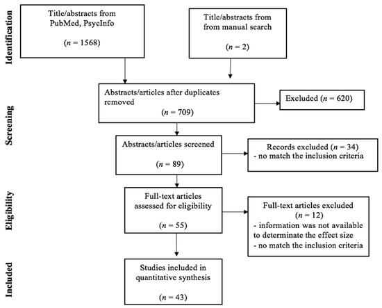 The search of the PubMed and PsycInfo databases and the manual search showed a total of 1570 citations. After removing the duplicates and reviewing the abstracts to exclude those that clearly did not meet the criteria (n = 620), 89 remained. Of these, 34 studies were excluded, because they did not meet the inclusion criteria. Of the 55 studies that remained, 12 studies were further discarded. Figure 1 illustrates the search and screening process. The 43 articles that met the inclusion criteria are listed in Table 1 and Table 2, along with their study characteristics. The total sample size of the selected studies comprised 10,391 participants; among them, 1345 were ED cases (AN = 521, BN = 278, BED = 325 and EDNOS = 221), and 9046 were healthy controls from the general population. The following is a summary of the literature concerning the association between ED, worry and rumination.