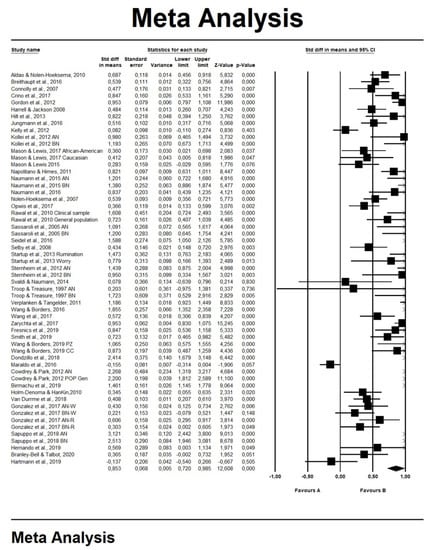 The presence of heterogeneity across the studies was evaluated by the I2 index, which measures the proportion of total variation due to real differences in the variability of ESs among studies [56]. The Q statistic was used to test the heterogeneity of the specific set of ESs and the effects of the selected moderators [56]. We considered the following moderators: (a) subtypes of ED symptoms (anorexia nervosa (AN), bulimia nervosa (BN) and binge eating disorder (BED)); (b) presence vs. absence of any diagnosis of EDs (i.e., the comparison between patients and healthy controls from the population); (c) subtype of RNT: worry or rumination and (d) mean age of the sample.