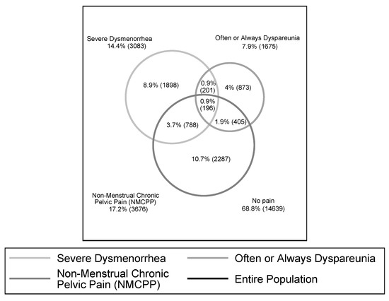 Because women could have reported more than one type of chronic pelvic pain, we assessed the overlap between severe dysmenorrhea, often or always dyspareunia, and NMCPP using a proportional Venn diagram (Figure 2). Almost a third of women experienced at least one severe or frequent form of chronic pelvic pain, and 1587 women (7.5%, 95% CI, 7.1–7.9), (Figure 2) reported two or three severe or frequent symptoms.