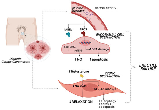 A higher glucose level is a hallmark of T2D and contributes to various metabolic derangements that promote endothelial dysfunction and vascular complications. Long-term hyperglycaemia reportedly leads to the increased generation of advanced glycation end-products (AGEs) and reactive oxygen species (ROS) [9,10,11,12], which may accelerate endothelial dysfunction through the impairment of endothelial NO synthase (eNOS) activity and NO production. As a result, an imbalance between vasoactive mediators and vasoconstrictors occurs, modifying the vascular permeability and resulting in a disruption of endothelial integrity. In this context, endothelial walls lose their sensitivity to mediators of vasodilation and increase their responses to vasoconstrictor stimuli, leading to in impaired vascular and smooth muscle relaxation, generating clinical ED [13].
