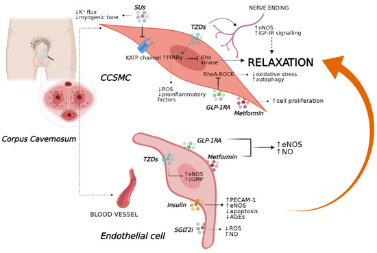 Importantly, endothelial dysfunction represents a key event not only in the development of atherosclerosis, but also of ED since impaired NO production by the endothelium and/or increased inactivation of NO by ROS is fundamental in the induction of an erection [150]. In this regard, Yuan et al. recently demonstrated that liraglutide could improve erection function in diabetes-induced ED by regulating smooth muscle dysfunction, oxidative stress and autophagy, independently of a glucose-lowering effect, in a rat model of T1D and in CCSMCs [151]. In addition, GLP-1R inhibition abolished the beneficial functions of liraglutide treatment [151].
