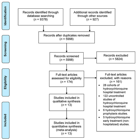 Randomized controlled trials (RCTs) in any language reporting benefit or harm outcomes from use of hydroxychloroquine vs. control (placebo or usual care) as treatment in hospitalized with reverse transcription-polymerase chain reaction (RT-PCR)-confirmed COVID-19. We excluded studies in COVID-19 outpatients, studies of prophylaxis with hydroxychloroquine (i.e., in those without COVID-19 disease) and studies evaluating chloroquine. Three investigators (A.V.H., V.P., Y.M.R.) independently screened each record title and abstract for potential inclusion. Three investigators (V.P., J.J.B., Y.M.R.) then read the full text of the records whose abstracts had been selected by at least one investigator. Discrepancies were resolved through discussion or by a fourth investigator (A.V.H.).