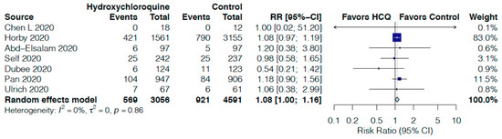 We reported our systematic review according to 2009 PRISMA guidelines [11]. Inverse variance random effect meta-analyses were performed to evaluate effect of HCQ vs. control or SoC on outcomes when outcome data was available for at least two RCTs judged to have homogeneous study characteristics. Effects of meta-analyses were reported as relative risks (RR) for dichotomous outcomes; we also calculated their 95% confidence intervals (CIs). CIs of effects were adjusted with the Hartung-Knapp method [12], and the between study variance tau2 was calculated with the Paule-Mandel method [13]. Heterogeneity of effects among studies was quantified with the I2 statistic (an I2 > 60% means high heterogeneity). We pre-specified subgroup analyses by type of control and RoB; the p for interaction test <0.05 indicated effect modification by subgroup. The meta package of R 3.5.1 (www.r-project.org, accessed on 10 December 2020) was used for meta-analyses. The quality of evidence was evaluated using the GRADE methodology, which covers 5 aspects: risk of bias, inconsistency, indirectness, imprecision and publication bias [14]. Quality of evidence was evaluated per outcome and described in summary of findings (SoF) tables; GRADEpro GDT was used to create SoF tables [15].