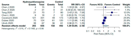 - Axfors, C.; Schmitt, A.M.; Janiaud, P.; van’t Hooft, J.; Abd-Elsalam, S.; Abdo, E.F.; Abella, B.S.; Akram, J.; Amaravadi, R.K.; Angus, D.C.; et al. Mortality outcomes with hydroxychloroquine and chloroquine in COVID-19 from an international collaborative meta-analysis of randomized trials. Nat. Commun. 2021, 12, 1–13. [Google Scholar]