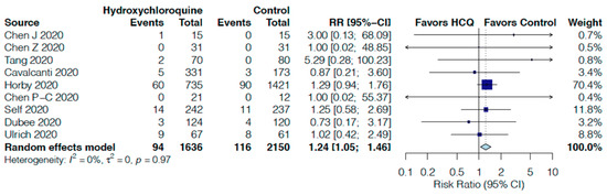 HCQ non-significantly increased the composite endpoint of clinical recovery by 26% in two RCTs [23,25] but with high heterogeneity (RR 1.26, 95%CI 0.87–1.83, I2 = 76%, Supplementary Figure S6) while HCQ also significantly increased the composite endpoint of clinical worsening by 14% in two RCTs [21,25] with no noted heterogeneity (RR 1.14, 95%CI 1.11–1.18, I2 = 0%, Supplementary Figure S7).