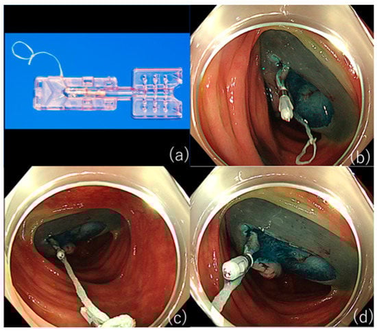 - Otake, Y.; Saito, Y.; Sakamoto, T.; Aoki, T.; Nakajima, T.; Toyoshima, N.; Matsuda, T.; Ono, H. New Closure Technique for Large Mucosal Defects after Endoscopic Submucosal Dissection of Colorectal Tumors (with Video). Gastrointest. Endosc. 2012, 75, 663–667. [Google Scholar] [CrossRef]