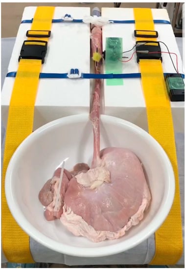 - Misumi, Y.; Nonaka, K.; Kishino, M. Development of an Animal Model That Reproduces Pulsations for Training in Esophageal Endoscopic Submucosal Dissection. Endoscopy 2020. [Google Scholar] [CrossRef]