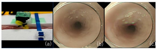 Although various approaches can be used to avoid accidental injury, as described above, it is fundamentally important to acquire a reliable ESD technique that does not cause accidental injury. Although it has been reported that it is generally favorable to start ESD training in the gastric antrum and the rectum because of the thickness of their walls [51], the incidence of gastric cancer is not as high in Europe and the United States as in Asia [52], and it is considered difficult to obtain a chance to improve the technique. The use of pig internal organs as a training model has been reported as a method for the acquisition of techniques before endoscopic treatment in actual clinical practice [53,54,55]. While this model is useful for acquiring basic techniques, it is certainly not realistic because of the absence of factors that make ESD difficult in actual clinical practice, such as heart rate and respiratory variability. Therefore, we have successfully developed an animal model with a heartbeat that is more in line with actual clinical practice [56] and used it to teach future clinicians (Figure 4). As the model has a motor devise that rotates at 80 cycle/min (approximately a normal human heart rate) in approximately 30 cm from the incisors of pig organ, we can perform realistic esophageal ESD training (Figure 5). It is also possible to learn about troubleshooting for intraoperative complications using ex vivo animal models. We can practice suturing a perforation intentionally made by an ESD knife with a hemostatic clip. Intraoperative bleeding, which may seem impossible to reproduce, can be reproduced by injecting red ink into the blood vessels of the organ, allowing us to practice hemostasis [57]. While some facilities and regions may have problems, such as unavailability of pig organs and cleaning of scopes used in animal models, we have also begun to conduct ESD training using Versatile Training Tissue (VTT; KOTOBUKI medical, Yashio, Saitama, Japan) made of “konjac”, a food item, which are readily available and do not require special care to clean the scope [58]. The virtual digestive tract wall is reproduced by placing VTT on a pedestal made of items found in the endoscopy lab, such as an empty plastic apron box, gauze, and rods (Figure 6). As VTT has a three-layer structure, including simulated mucosal, submucosal, and muscle layers, realistic ESD training can be performed by following the normal procedure. A training kit that includes a training model using PVA-H (EndoGel (Sunarrow Kasei Co., LTD, Tokyo, Japan)) [59] and eliminates the hygiene aspect has been reported; however, the konjac model is overwhelmingly cheaper (USD 450 vs. USD 60, respectively). Trainees need to repeat training using these in vitro models to acquire the basic ESD techniques. It is desirable to start the actual treatment from a site in which it is easy to manipulate a scope, such as the antrum or rectum. In addition, it is important for the trainee to be able to complete the ESD procedure in a small number of cases without complications by having one-on-one guidance and techniques and strategies shared with them in real time. In addition, adequate infection control measures, such as full personal protective equipment, should be taken during one-to-one guidance during the COVID-19 pandemic.