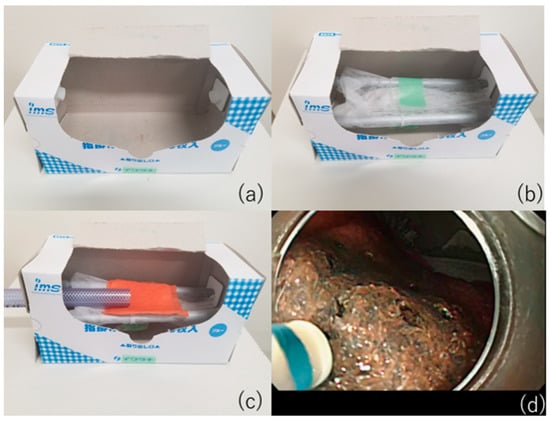 VTT ESD training model without special items. (a) An empty plastic apron box. (b) Place two rods in the box and wrap gauze around them like a stretcher. (c) Penetrate the hose into the box and place the VTT on the gauze. (d) A view during training with the VTT “konjac”, a food item model.