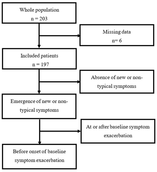 In the group of patients who experienced new or non-typical symptoms before onset of baseline symptom exacerbation, the analysis of these symptoms showed that they were heterogeneous and varied between patients, however, they were almost constant for each patient. Table 2 shows the proportion of the different prodromal new or non-typical symptoms.