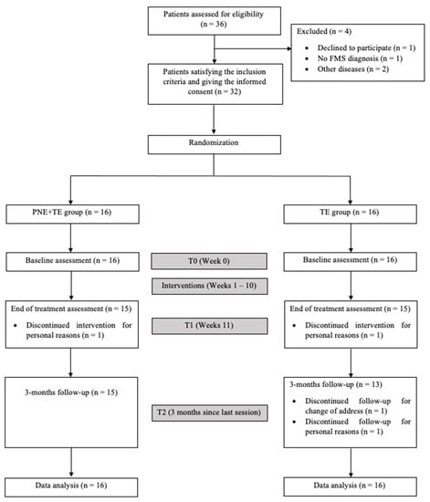 A total of 32 women with FMS that met the inclusion criteria were randomized into the TE group (n = 16) or the PNE + TE group (n = 16) (Figure 1). Participants had a mean age of 52.59 (±10.37) years, with a mean height of 1.59 (±0.05) m, mean body weight of 71.13 (±14.9) kg, and mean BMI of 28.02 (±6.09) kg/m2. Clinical variables were similar between both groups at baseline (Table 1).