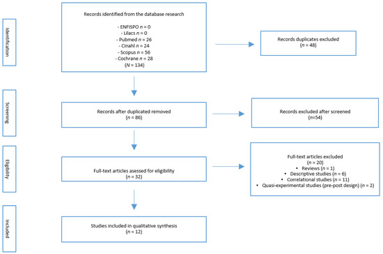 A total of 134 articles were identified from the various databases. After eliminating duplicates, a total of 86 remained, of which 32 articles were selected based on the title and abstract analysis. From the full text analysis of these 32 studies, according to the established selection criteria, a total of 12 RCTs were finally selected [17,18,19,20,21,22,23,24,25,26,27,28] (Figure 1).
