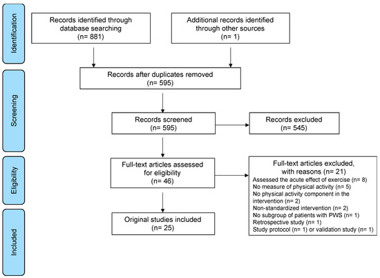 Three electronic databases (PubMed, Web of Science, and EMBASE) were searched for original articles published between January 2000 and December 2020 using the search terms “Prader-Willi Syndrome” AND “Physical activit*” OR “Exercise” OR “Training” OR “Aerobic training” OR “Resistance training” OR “Strength training” OR “Walking” OR “Sitting time” OR “Sedentary”. Reference lists from the resulting reviews and articles were screened to identify additional articles.