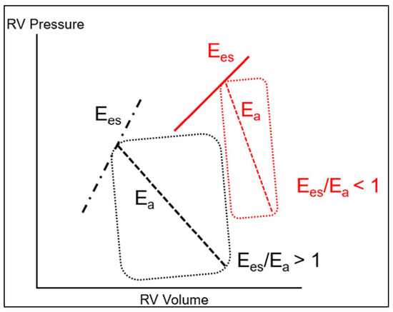 The maintenance of normal RV function requires that it remains constantly adapted to the hydraulic load imposed by the pulmonary circulation, which defines the concept of RV-PA coupling, indicating the efficiency of energy transfer from the RV to the pulmonary circulation [56]. RV-PA coupling is best described by the ratio of RV maximal elastance (Ees) to arterial elastance of the PA (Ea) [57]. Ees represents a load independent measure of RV contractility, dependent on RV muscle mass and on the contractile properties of cardiomyocytes, whereas Ea is a representation of the hydraulic load of the pulmonary circulation [58]. This is schematically represented on the RV pressure–volume curve (Figure 1). Ees can be determined as the slope of the end-systolic PV relationship (Ees = RV end-systolic pressure/end-systolic volume), while Ea is depicted as the slope of the relationship between RV end-systolic pressure and RV stroke volume. Optimal coupling is indicated by a Ees/Ea ratio > 1, implying efficient RV to PA energy transfer. In the clinical setting, RV-PA coupling can be evaluated by the ratio of one surrogate determinant of RV systolic elastance, such as RV stroke work [59], TAPSE, or RV FAC [60], to one surrogate determinant of PA elastance, such as PA pressure [21,25].