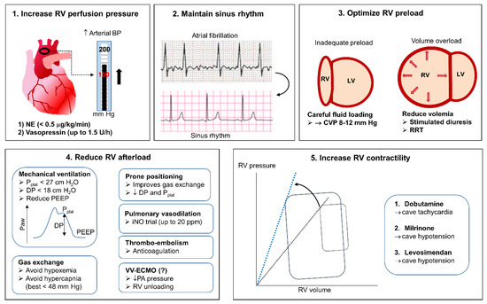 Treatment of RV dysfunction in COVID-19 must follow the usual recommendations for acute RV failure of any etiology, including maintenance of perfusion pressure, preload optimization, reduction of afterload, and inotropic support. In addition, some specific aspects related to the role of systemic inflammation and coagulopathy in COVID-19 must be considered.