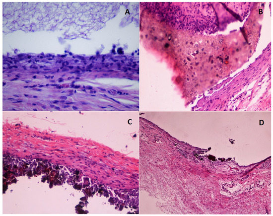 Hematoxylin–eosin stain. (A): Control. Fibrous capsule 30 days (×400). (B): Theracal LC fibrous capsule 45 days (×200). (C): MTA fibrous capsule surface calcification 45 days (×200). (D): MTA-G3 fibrous capsule calcification 45 days (×100).