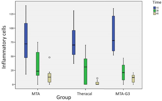 If we compare the inflammatory reaction to the three materials according to periods, in the samples of 15 and 30 days, no differences were found between the three materials. However, in the 45-day samples, the differences are significant (p = 0.021). In this period, the median value of inflammatory cells with MTA turned out to be 13 cells, Md (IQR) = 13 (18.75), in Theracal LC it was 0 cells, Md (IQR) = 0 (6) and in the samples with MTA-G3 it was 12.5 cells (15.25) (Table 3 and Figure 3).