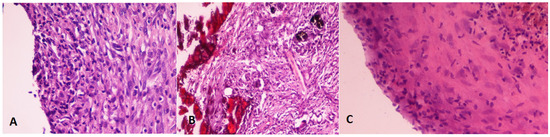 To obtain the samples, the dorsal region of the rats was shaved in the groups in which the implantation of the biomaterials had been 30 and 45 days. In the 15-day group, it was not necessary. Subsequently, with a number 15 scalpel blade (Surgical Disposable Scalpel nº 15, Aesculap, Braun, Tuttlingen, Germany) and sterile scissors (Tekno 8365, Tekno Medical, Tuttlingen, Germany), the skin and subcutaneous connective tissue around the implant, including it, were resected. The surface area of the samples was approximately 2 cm × 2 cm. The samples were then placed in a 10% buffered formaldehyde solution (Histogen 40, Serosep Ltd., Limerick, Ireland) until they were processed in the pathology laboratory.