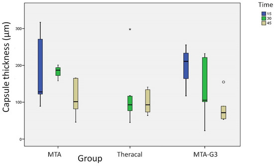 Regarding the thickness of the fibrous capsule, no statistically significant differences were found in MTA of 15, 30 and 45 days (p = 0.08), nor in MTA-G3 (p = 0.068). With respect to Theracal LC, none of the 15-day histological sections presented mature capsules, and no significant differences were found in the thickness of the capsules in the 30-day samples compared to the 45-day samples (p = 0.834) (Figure 5 and Table 8). If we compare the median value of the measurement in microns of the three materials with each other, by periods, we obtain that there is a significant difference between MTA/MTA-G3 and Theracal LC in the 30-day samples (p = 0.041). The capsule formed against MTA and MTA-G3 was found to be 94 µm thicker (Table 9).