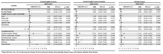 Subdistribution hazard models that accounted for competing mortality were used to estimate the adjusted subdistribution hazard ratio (SHR) of outcomes, with adjustments for age (<65 and ≥65 years old); sex (male and female); site of the index FF surgery (spine, upper limb, lower limb, and hip); CCI (0, 1, and ≥2); and comorbidities (cerebrovascular disease, chronic pulmonary disease, rheumatologic disease, peptic ulcer disease, diabetes, and renal disease). Risks of secondary FF, second FF surgery, and revision surgery in the EIBP and LIBP groups were also compared among the subgroups of the index FF surgery site and age [18].