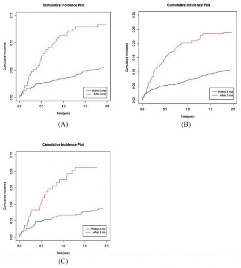 Cumulative incidence of (A) second fragility fracture, (B) second fragility fracture surgery, and (C) revision surgery in patients with bisphosphonate initiation within 3 months after fragility fracture surgery versus more than 3 months after fragility fracture surgery.